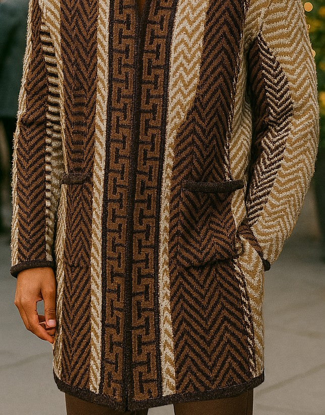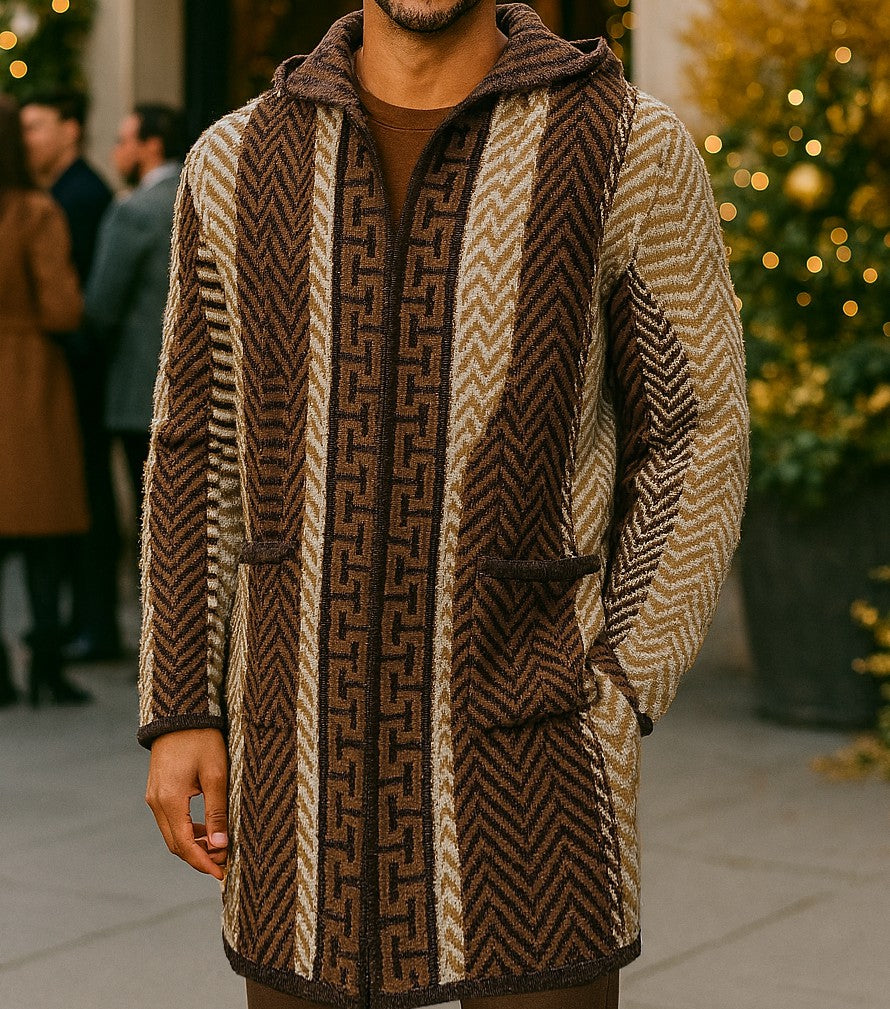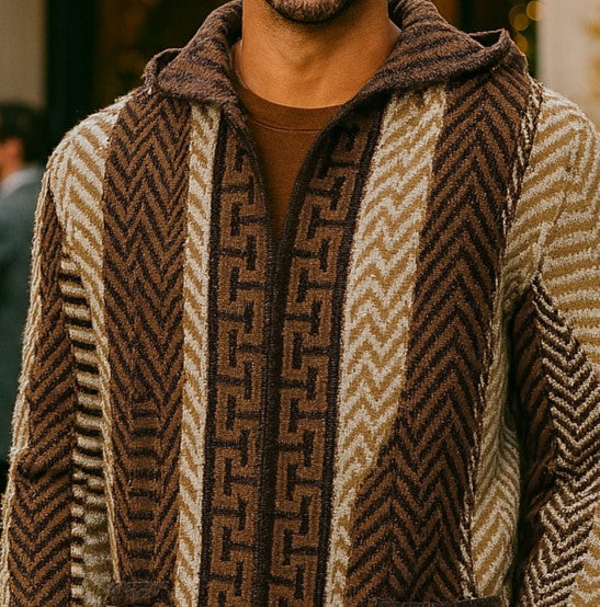 Mens SilverSilk Brown Tan Gray Greek Key Thick Knit Sweater Jacket w/ Hoody 82401