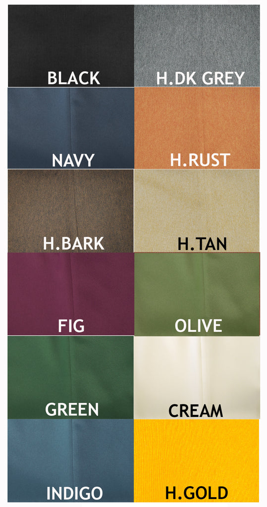 Choose from black, cream, h dk gray (heather charcoal), h rust (heather rust), olive.