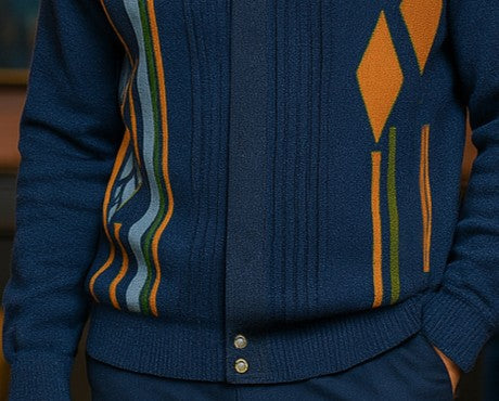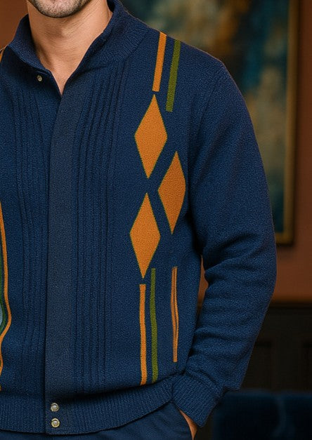 Mens SilverSilk Classy Navy Blue Rust Argyle Knit Zip Jacket w/ Elbow Patch 11009