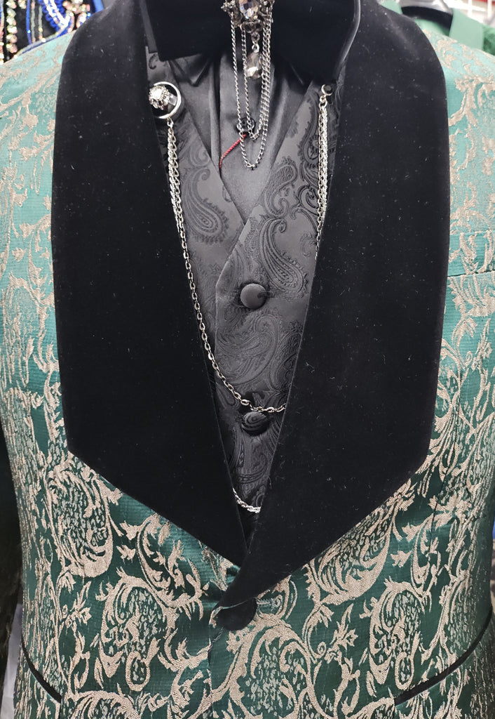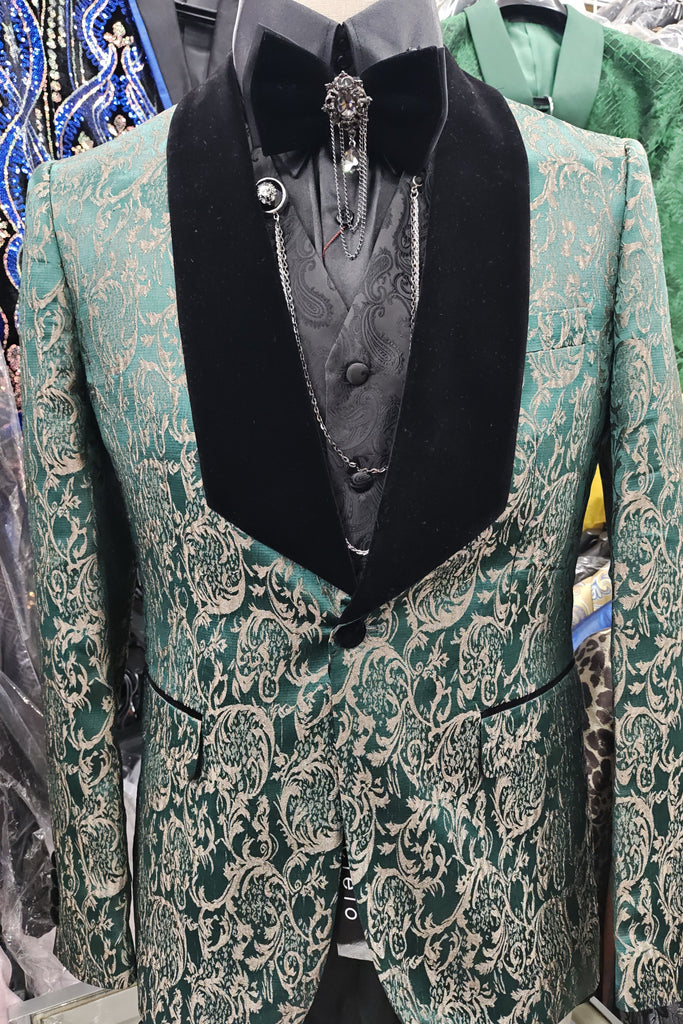 Mens Elegant Hunter Green Damask Black Velvet Collar Formal Dress Jacket BBT3643