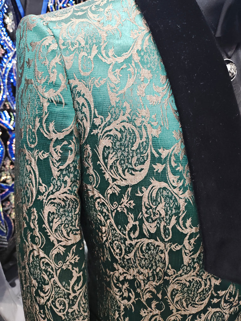 Gorgeous damask with rich black velvet collar. Single button closure. Made of deluxe high-grade fabric. Full construction jacket with exterior and interior pockets.