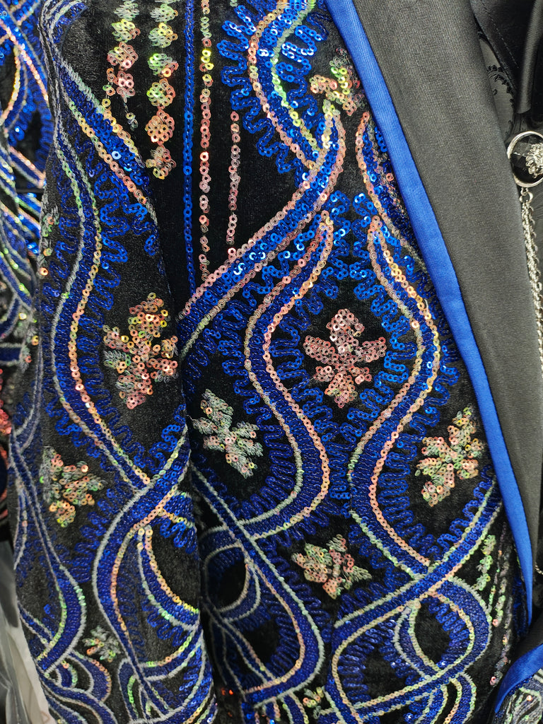 Magnificent single button sequin jacket with contrasting shawl collar lapel. Made of deluxe high-grade fabric. Full construction jacket with exterior and interior pockets.