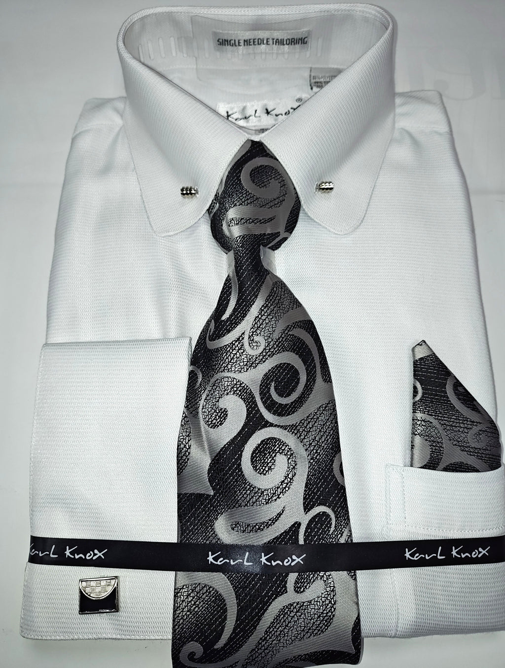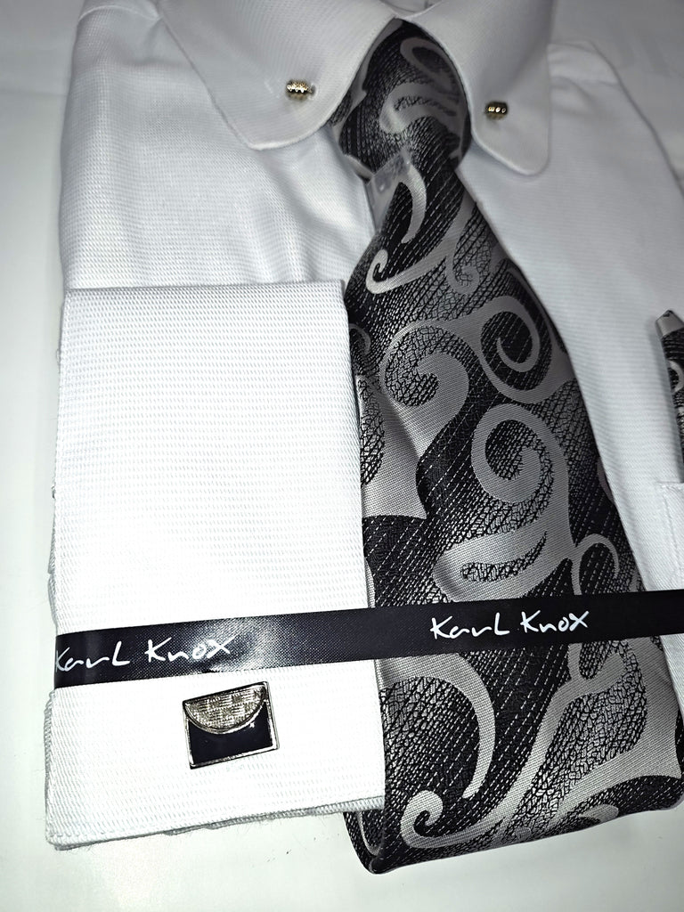 Mens Karl Knox designer dress shirt set. Classic fit dress shirt with coordinating paisley tie and handkerchief.